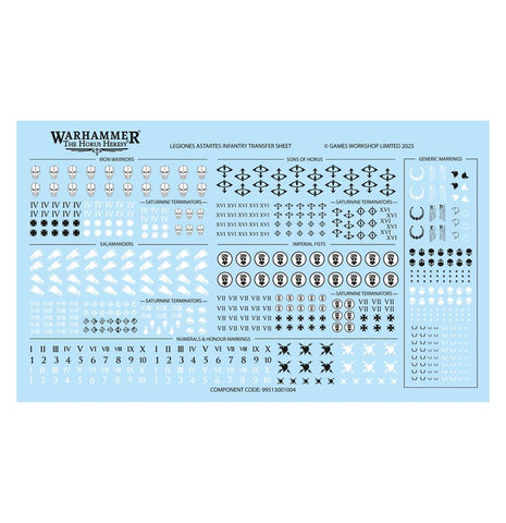 This kit is supplied with 1x Legiones Astartes Infantry Transfer Sheet, containing 618 high-quality waterslide transfers. These include symbols for the Iron Warriors, Sons of Horus, Salamanders, and Imperial Fists, along with numerals, honour markings, generic markings, script, and command icons.